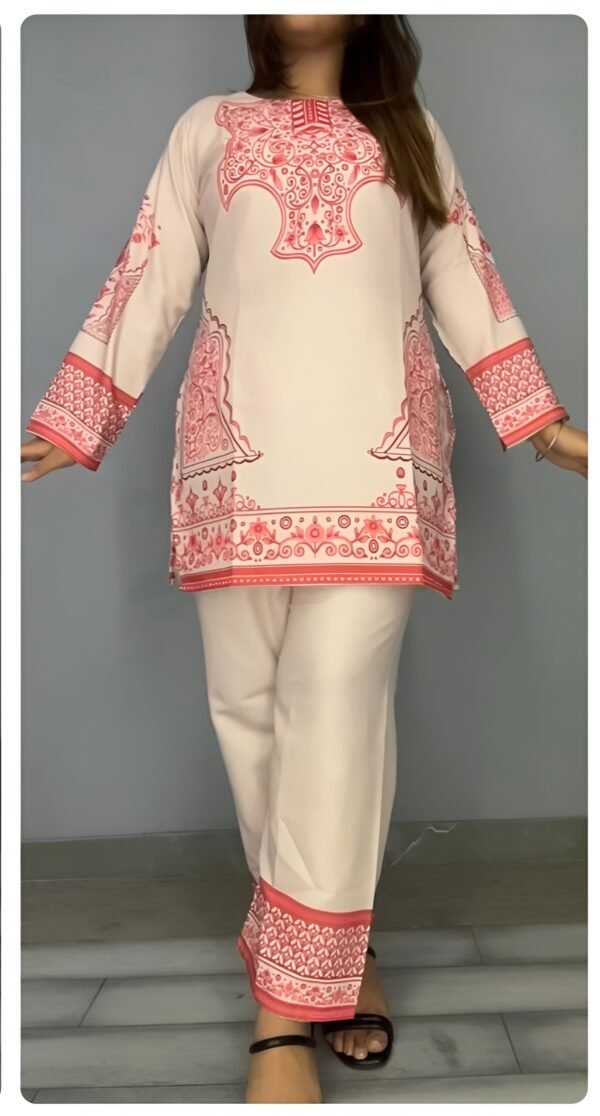 A soft cream co-ord set with bright pink traditional print detailing. Comfortable fabric, full-sleeve kurti, and matching straight pants—ideal for daily wear, outings, and casual styling.