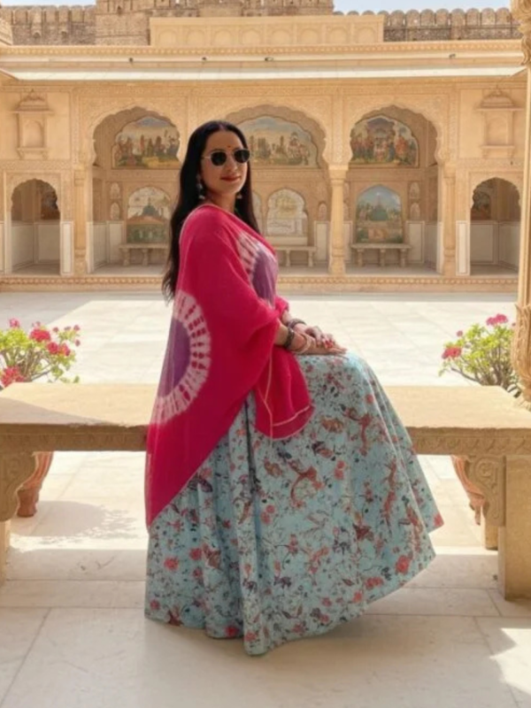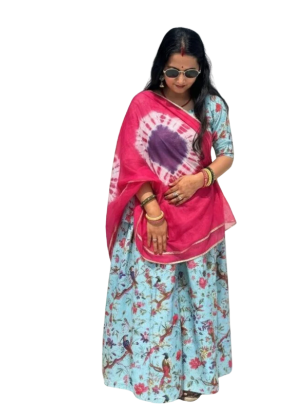 KIAE presents a beautiful fusion of floral elegance and traditional Bandhej art. This premium unstitched suit set features a soft blue floral fabric paired with a vibrant pink Bandhej dupatta, perfect for festive and casual occasions. Unstitched – stitching available as per customer requirement.
