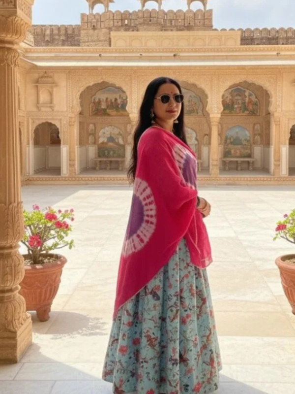 KIAE Elegant Floral Blue & Pink Bandhej Unstitched Suit Set – Premium Handcrafted Design with Dupatta
