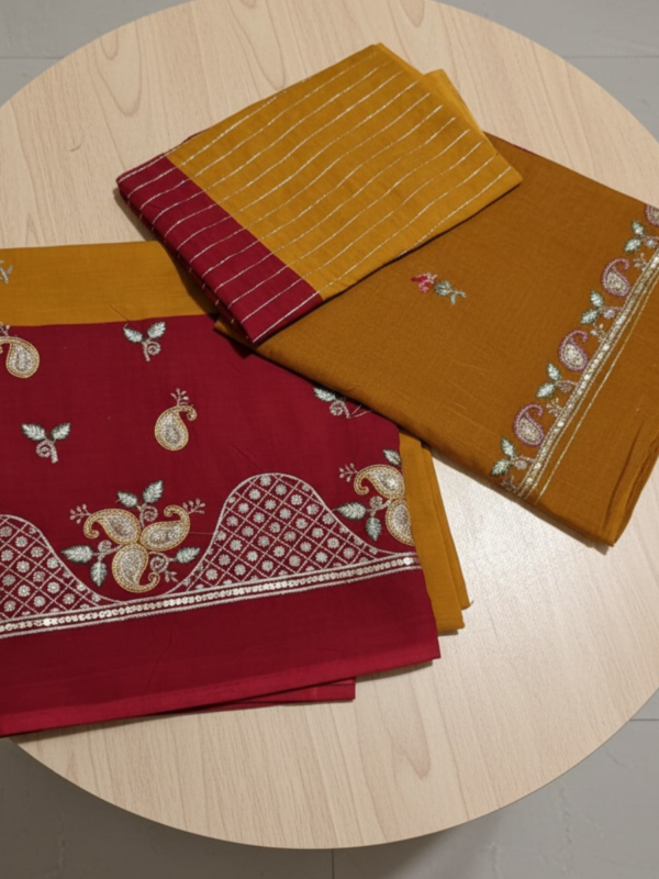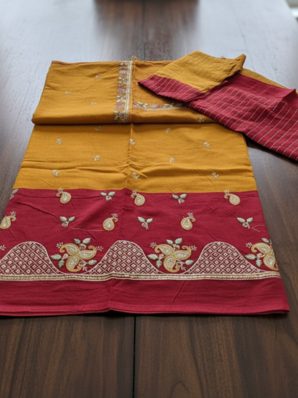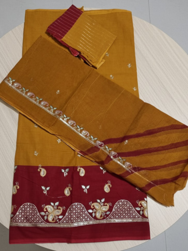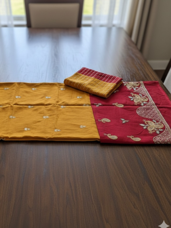 Experience royal charm with KIAE’s Authentic Rajasthani Rajputi Poshak in Yellow. This unstitched set features rich gota patti embroidery and a stunning yellow-red color blend, perfect for weddings, festivals, and special occasions. Redefine ethnic grace with this regal masterpiece from KIAE.