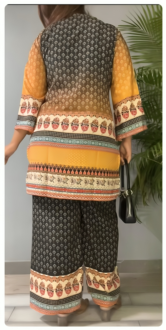 A mustard and brown cotton co-ord set with rich multicolor ethnic prints. Fully stitched, breathable, and perfect for festive casuals, outings, travel, or everyday comfort.