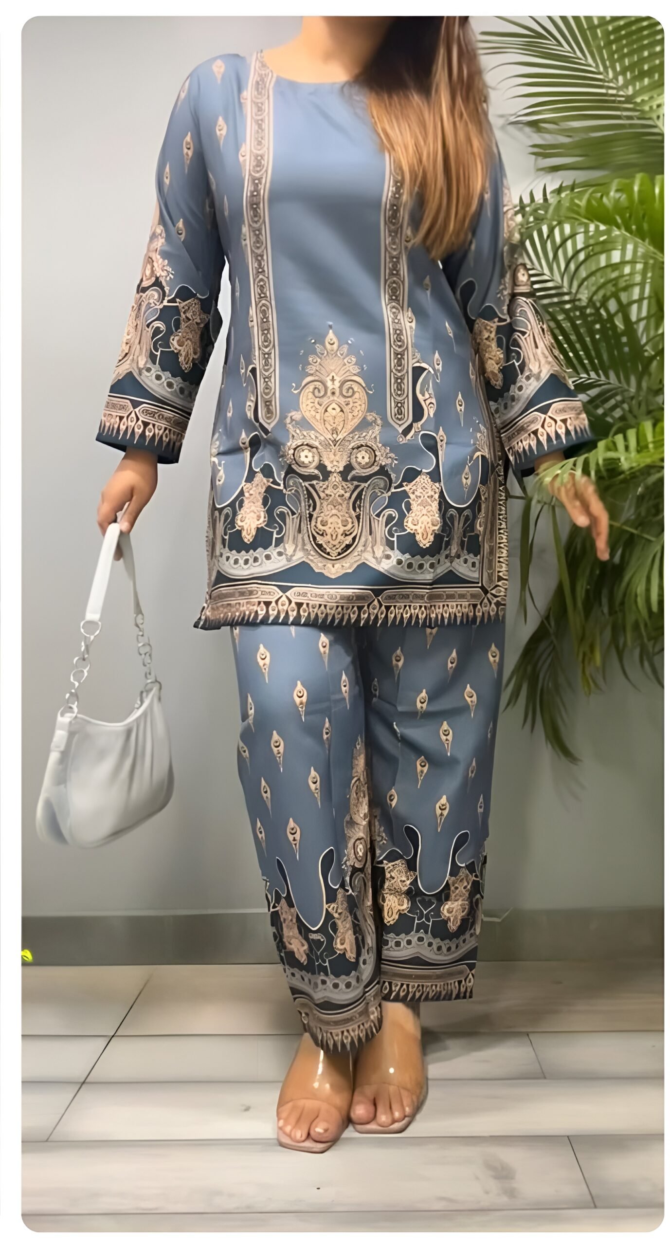 A classy blue printed co-ord set featuring intricate beige and navy motifs. Soft, comfortable fabric with a straight-fit kurti and matching pants—perfect for everyday wear, outings, or casual styling.